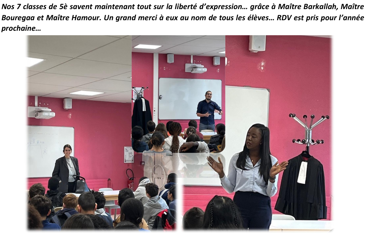 Vendredi 3 octobre, toutes les classes de 5e ont bénéficié d’un temps d’échange avec un(e) avocat(e) sur le thème de la liberté d’expression.